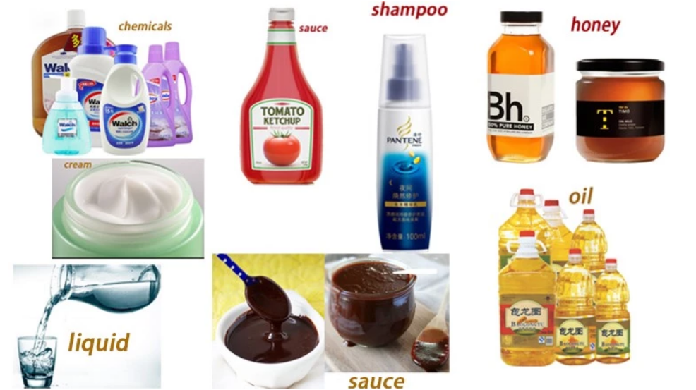 Likido erdi-likatsuak eta likatsuak; catsup, mostaza, jarabeak, salsa, maionesa, eztia, kakahuete gurina, jeliak, saltsak, ezpainetako balsamak, xanpua, xaboiak lodi, estetikoak, aurpegiko maskarak, argizaria, kola, koipeak, itsasgarriak, silikona eta askoz gehiago